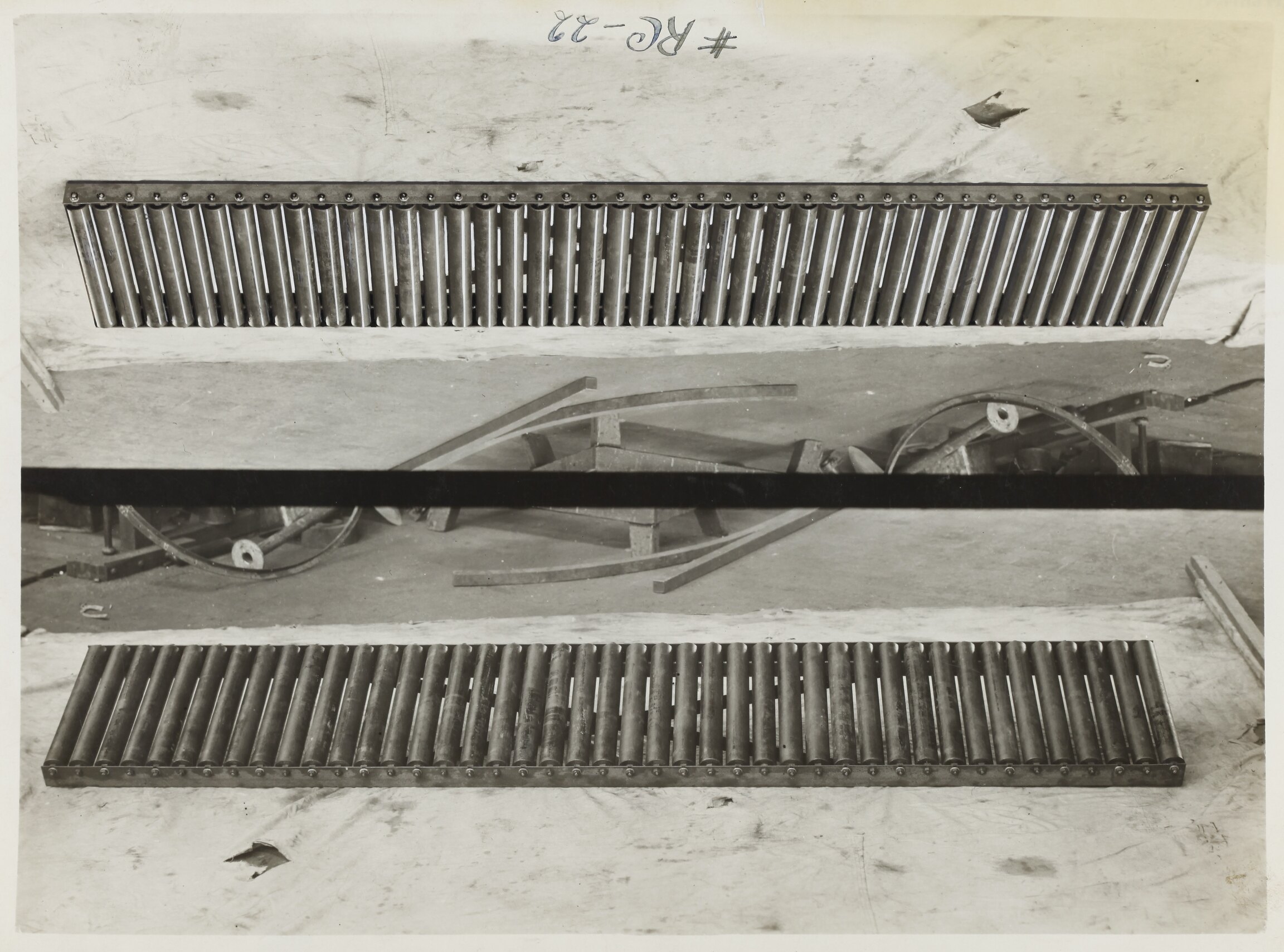 Black and white promotional image of conveyors. It is part of a collection of photographs and marked printer's copy used in the preparation of trade literature promoting products manufactured by the Schumacher Mill Furnishing Works Pty Ltd. The items were originally housed in a wooden filing drawer, with many filed by subject. This photograph was previously filed under 'LAYOUTS'.