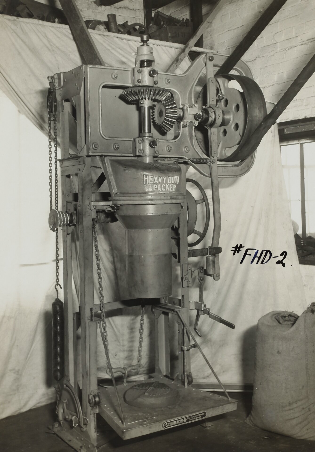 Black and white image depicting a pressure filler used to pack bran. It is part of a collection of photographs and marked printer's copy used in the preparation of trade literature promoting products manufactured by the Schumacher Mill Furnishing Works Pty Ltd. The items were originally housed in a wooden filing drawer, with many filed by subject. This photograph was previously filed under 'Bran'.