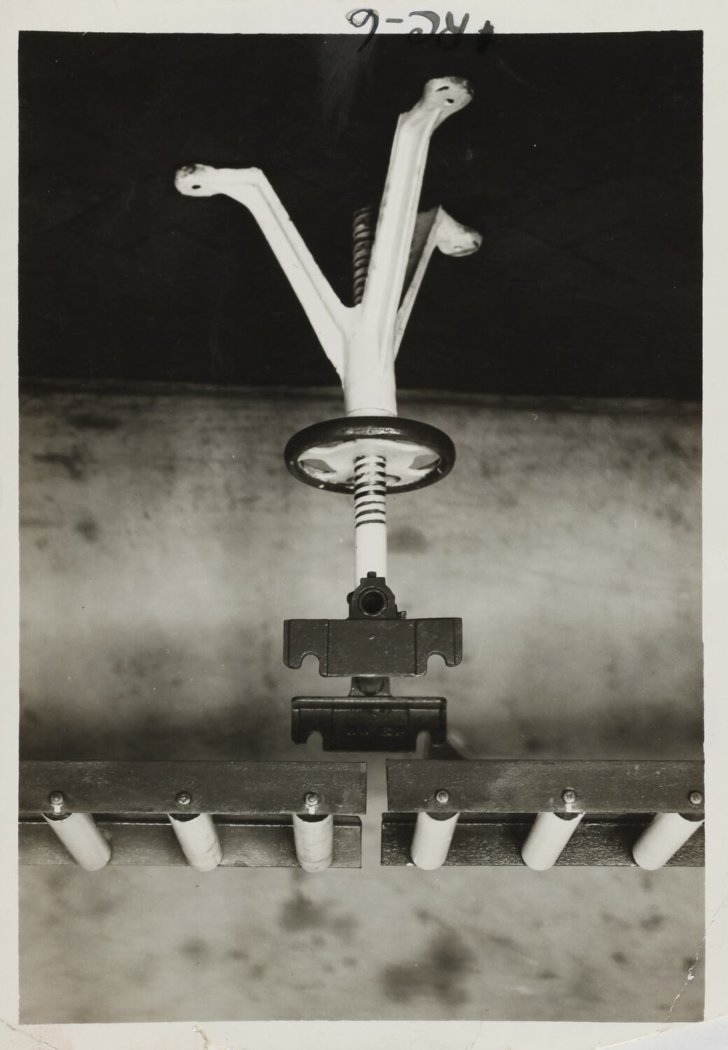 Black and white promotional image of a conveyor and stand. It is part of a collection of photographs and marked printer's copy used in the preparation of trade literature promoting products manufactured by the Schumacher Mill Furnishing Works Pty Ltd. The items were originally housed in a wooden filing drawer, with many filed by subject. This photograph was previously filed under 'LAYOUTS'.