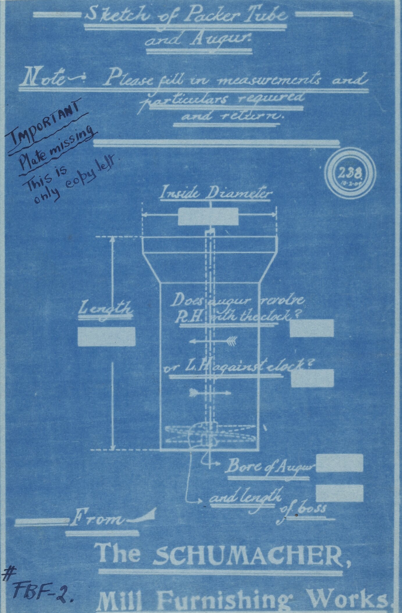 Cyanotype sketch showing the packer tube and auger of a flour packing machine. It is part of a collection of photographs and marked printer's copy used in the preparation of trade literature promoting products manufactured by the Schumacher Mill Furnishing Works Pty Ltd. The items were originally housed in a wooden filing drawer, with many filed by subject. This photograph was previously filed under 'Bran'.