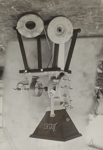 Black and white promotional image of machinery. It is part of a collection of photographs and marked printer's copy used in the preparation of trade literature promoting products manufactured by the Schumacher Mill Furnishing Works Pty Ltd. The items were originally housed in a wooden filing drawer, with many filed by subject. This photograph was previously filed under 'LAYOUTS'.