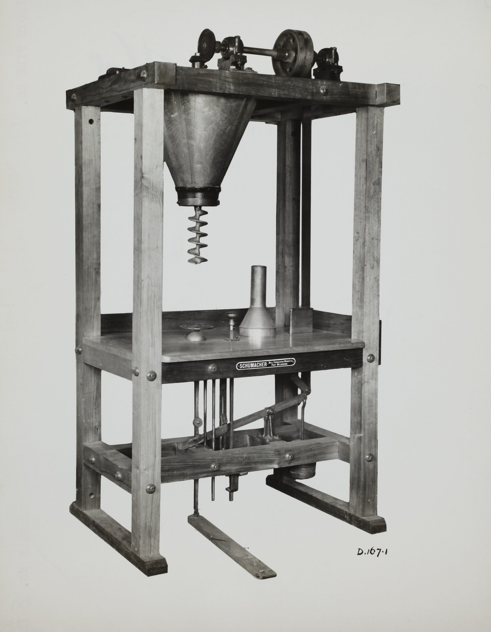 Black and white promotional image of a lightning filler. It is part of a collection of photographs and marked printer's copy used in the preparation of trade literature promoting products manufactured by the Schumacher Mill Furnishing Works Pty Ltd. The items were originally housed in a wooden filing drawer, with many filed by subject. This photograph was previously filed under 'Lightning'.