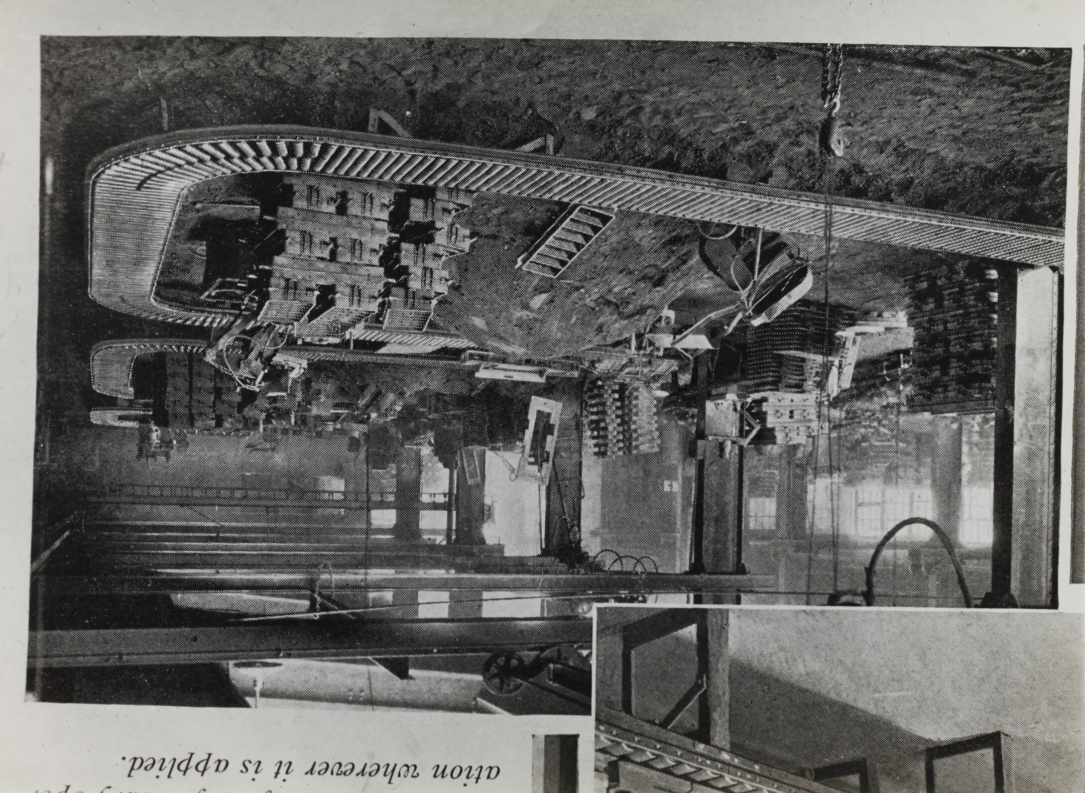 Black and white promotional image of a factory interior showing a conveyor. It is part of a collection of photographs and marked printer's copy used in the preparation of trade literature promoting products manufactured by the Schumacher Mill Furnishing Works Pty Ltd. The items were originally housed in a wooden filing drawer, with many filed by subject. This photograph was previously filed under 'LAYOUTS'.