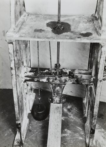Black and white image showing detail of machine parts. It is part of a collection of photographs and marked printer's copy used in the preparation of trade literature promoting products manufactured by the Schumacher Mill Furnishing Works Pty Ltd. The items were originally housed in a wooden filing drawer, with many filed by subject. This photograph was previously filed under 'Lightning'.