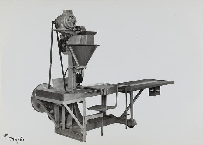 Hand written in black ink on front of photograph: '#736/6' Printed in red ink on back of photograph: 'PHOTO FILE NO. / OFFICE COPY' Hand written in grey pencil on back of photograph: '10 / 8-C / 736' Printed in black ink on back of photograph: 'SECTION NO. / SPECIAL PORTABLE TRIUMPH FILLING MACHINE / WITH TRAVELLING TABLE AND / SEPARATE CHECK-WEIGHTING TABLE / SUPPLIED TO OR. 45806 -- 18.4.45.'