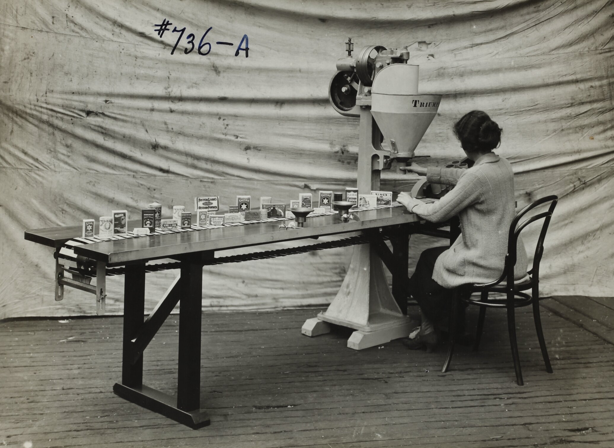 Black and white promotional image showing a woman operating a Triumph Filling Machine. It is part of a collection of photographs and marked printer's copy used in the preparation of trade literature promoting products manufactured by the Schumacher Mill Furnishing Works Pty Ltd. The items were originally housed in a wooden filing drawer, with many filed by subject. This photograph was previously filed under 'Triumph'.