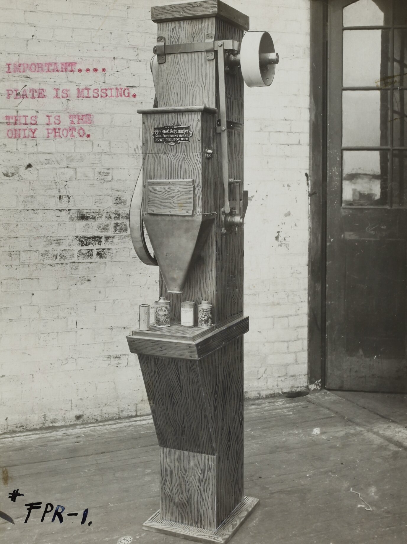 Printed in red ink on front of photograph: 'IMPORTANT.... / PLATE IS MISSING. / THIS IS THE / ONLY PHOTO.' Hand written in black ink on front of photograph: '#FPR-1.' Hand written in red pencil on back of photograph: 'OFFICE / Copy' Hand written in grey pencil on back of photograph: '2 oz prop[?] / 4 / 8-F' Printed in red ink on back of photograph: 'SECTION NO' Printed in black ink on back of photograph: 'PHOTO FILE NO' Hand written in black ink on back of photograph: 'Premier Package Filling Machine / Make Block 4" high and get some / grain into the wood:-'