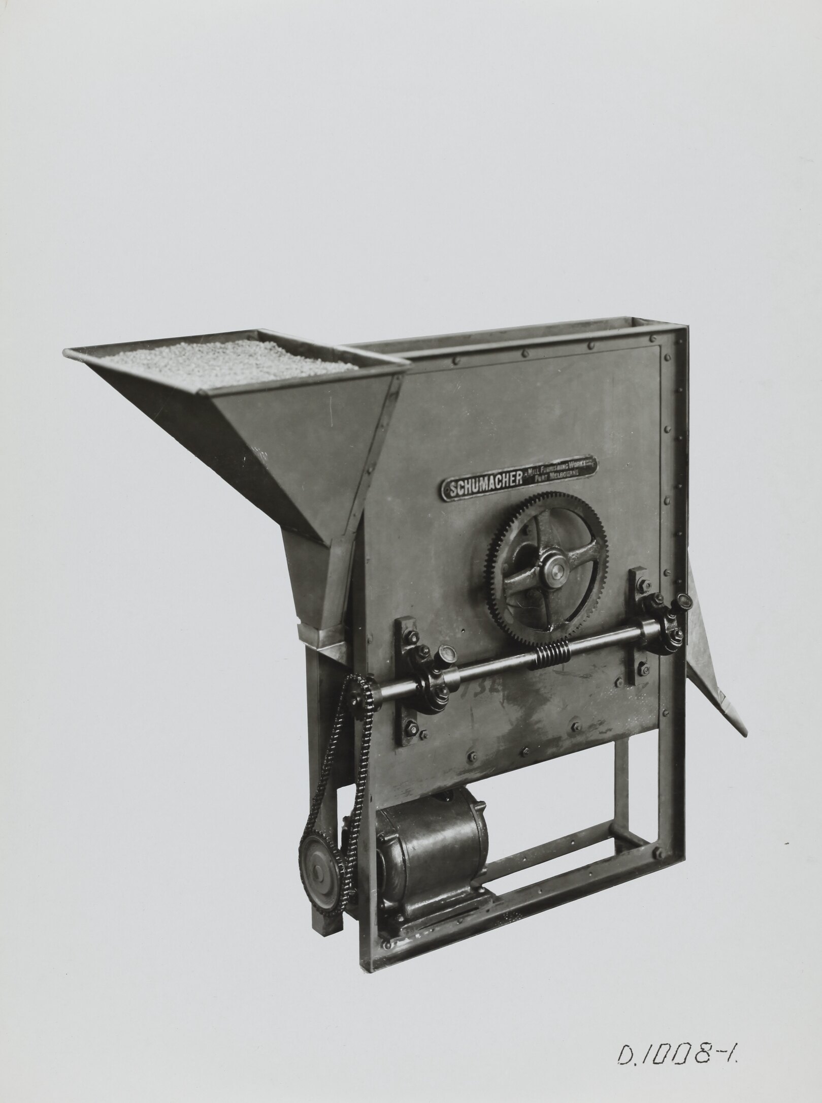 Hand written in black ink on front of photograph: 'D.1008.1.' Printed in black ink on back of photograph: 'Kerr / BROS. / COMMERCIAL / PHOTOGRAPHERS / 533 COLLINS ST. MELBOURNE' Printed in black ink on back of photograph: 'SCHUMACHER MILL FURNISHING WORKS PTY. LTD. / GRAHAM ST. PORT MELBOURNE. / S. C. 7 VICTORIA. / TELEPHONE MX 2171'