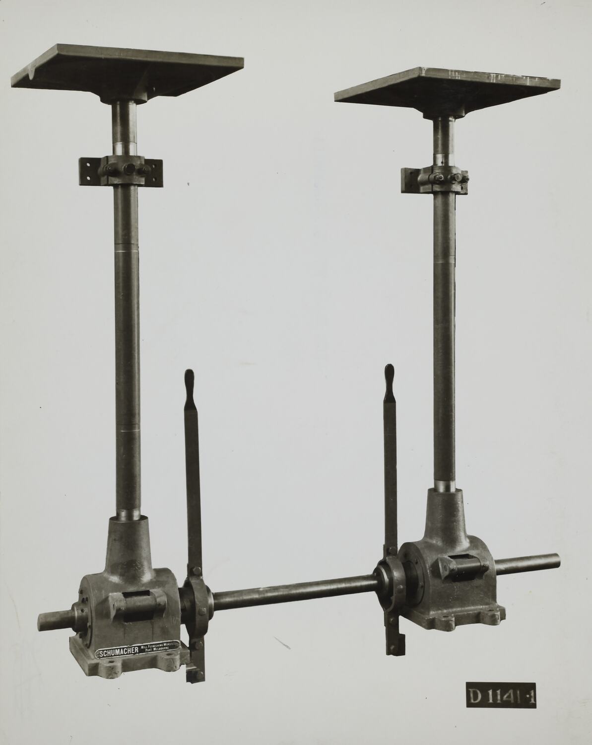 Printed in grey on front of photograph: 'D.1141-1' Printed in purple ink on back of photograph: 'Kerr / BROS. / COMMERCIAL / PHOTOGRAPHERS / 533 COLLINS ST. MELBOURNE' Printed in black ink on back of photograph: 'VIBRATORY TABLE TYPE UNIT' Hand written in grey pencil on back of photograph: '8 E[strikethrough]' Printed in black ink on back of photograph: 'SCHUMACHER MILL FURNISHING WORKS PTY. LTD. / GRAHAM ST. PORT MELBOURNE. / S. C. 7 VICTORIA. / TELEPHONE MX 2171'