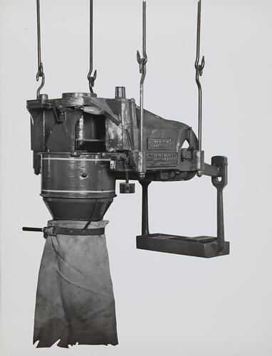 Black and white promotional image of a machine hanging from metal hooks. It is part of a collection of photographs and marked printer's copy used in the preparation of trade literature promoting products manufactured by the Schumacher Mill Furnishing Works Pty Ltd. The items were originally housed in a wooden filing drawer, with many filed by subject. This photograph was previously filed under 'Miscellaneos'.