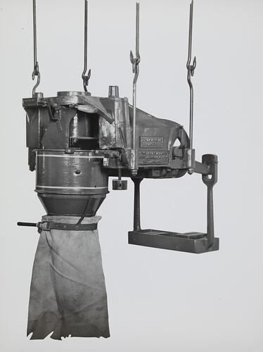 Black and white promotional image of a machine hanging from metal hooks. It is part of a collection of photographs and marked printer's copy used in the preparation of trade literature promoting products manufactured by the Schumacher Mill Furnishing Works Pty Ltd. The items were originally housed in a wooden filing drawer, with many filed by subject. This photograph was previously filed under 'Miscellaneos'.