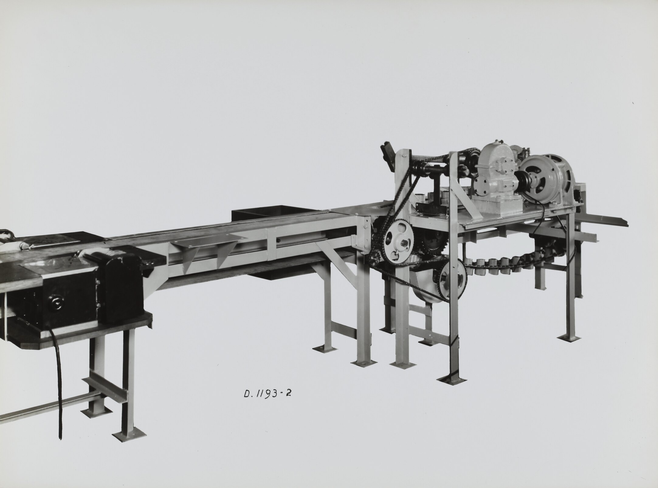 Black and white promotional image of a machine. It is part of a collection of photographs and marked printer's copy used in the preparation of trade literature promoting products manufactured by the Schumacher Mill Furnishing Works Pty Ltd. The items were originally housed in a wooden filing drawer, with many filed by subject. This photograph was previously filed under 'Miscellaneos'.