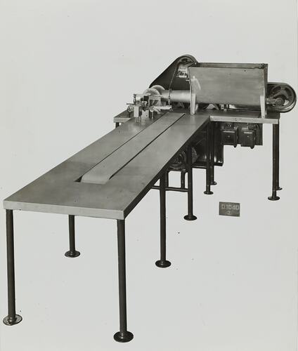 Printed in grey on front of photograph: 'D.1040 / 2' Printed in black ink on back of photograph: 'BROS. / COMMERCIAL / PHOTOGRAPHERS / 533 COLLINS ST. MELBOURNE' Printed in red ink on back of photograph: 'PHOTO FILE NO. / SECTION NO.' Hand written in grey pencil on back of photograph: '14' Hand written in red pencil on back of photograph: 'OFFICE Copy' Hand written in black ink on back of photograph: 'Automatic Margarine / Pounding Machine / Or No 36715 / 1937.'