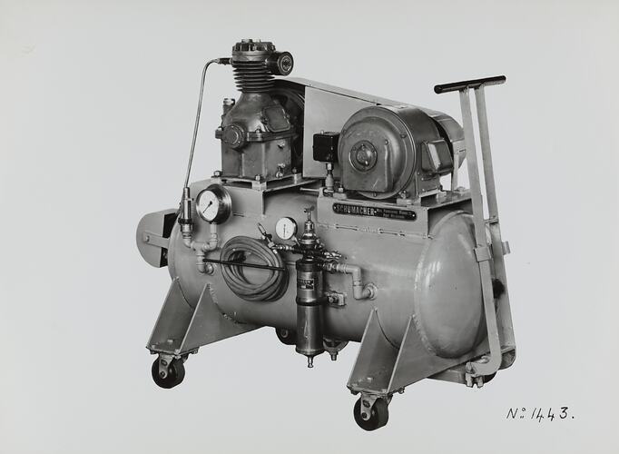 Black and white promotional image of compressed air spray unit equipment. It is part of a collection of photographs and marked printer's copy used in the preparation of trade literature promoting products manufactured by the Schumacher Mill Furnishing Works Pty Ltd. The items were originally housed in a wooden filing drawer, with many filed by subject. This photograph was previously filed under 'Miscellaneos'.