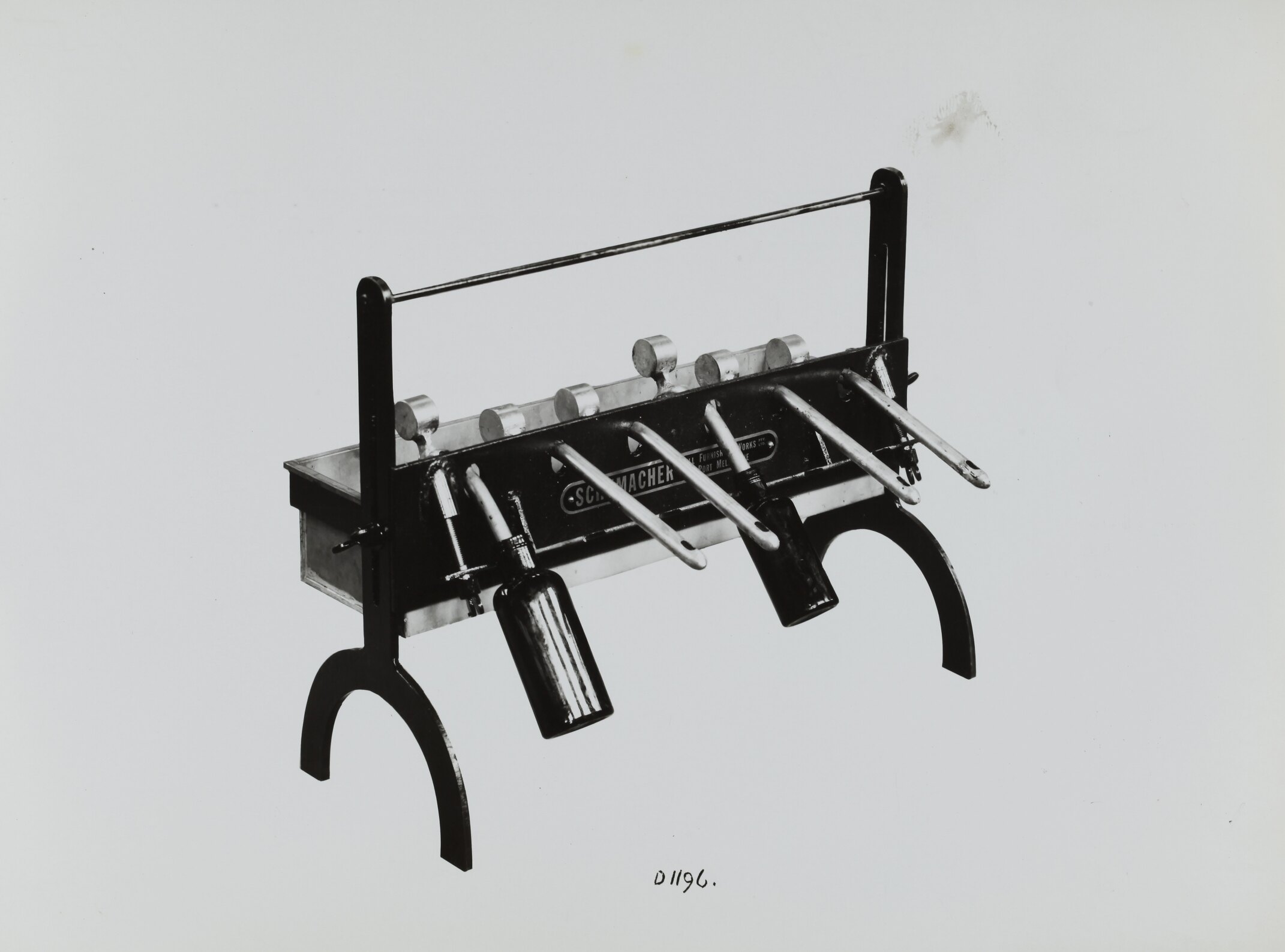 Printed in black on front of photograph: 'D1196' Printed in black ink on back of photograph: 'Kerr / BROS. / COMMERCIAL / PHOTOGRAPHERS / 533 COLLINS ST. MELBOURNE' Hand written in grey pencil on back of photograph: 'Box #19 / 8-F' Printed in black ink on back of photograph: 'SCHUMACHER MILL FURNISHING WORKS PTY. LTD. / GRAHAM STREET, PORT MELBOURNE. S. C. 7 / VICTORIA. TELEPHONE MX 2171 / SYPHON BOTTLE FILLING MACHINE.'