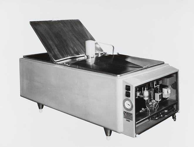 Black and white promotional image of a refrigerated milk tank. It is part of a collection of photographs and marked printer's copy used in the preparation of trade literature promoting products manufactured by the Schumacher Mill Furnishing Works Pty Ltd. The items were originally housed in a wooden filing drawer, with many filed by subject. This photograph was previously filed under 'Miscellaneos'.