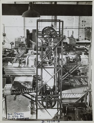 Hand written in black ink on front of photograph: 'See PHOTO / D.1432 for / SLAT CONVEYOR / D.1438-2' Printed in black ink on back of photograph: 'Kerr / BROS. / COMMERCIAL / PHOTOGRAPHERS / 533 COLLINS ST. MELBOURNE' Printed in red ink on back of photograph: 'OFFICE COPY.' Printed in black ink on back of photograph: 'LOWERATOR supplied to Or. 47806. / (Note -- right hand side photo shows / part of Roller Chain conveyor, 47806, / and Slat Conveyor, 48265.)