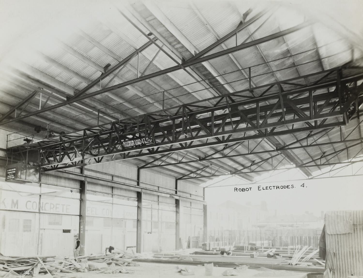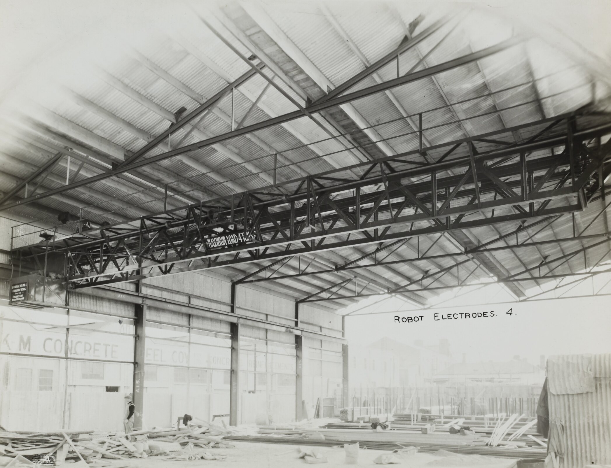 Hand written in black ink on front of photograph: 'ROBOT ELECTRODES. 4.' Printed in black ink on back of photograph: 'SUTCLIFFE PTY. LTD. / Commercial Photographers / 366 BOURKE ST. MELBOURNE. / Corner of Elizabeth Street.' Printed in red ink on back of photograph: 'PHOTO FILE NO. / SECTION NO.' Hand written in grey pencil on back of photograph: '14 / With Compliments / [indecipherable] Industries' Printed in blue ink on back of photograph: 'SCHUMACHER MILL FURNISHING WORKS PTY. LTD.'