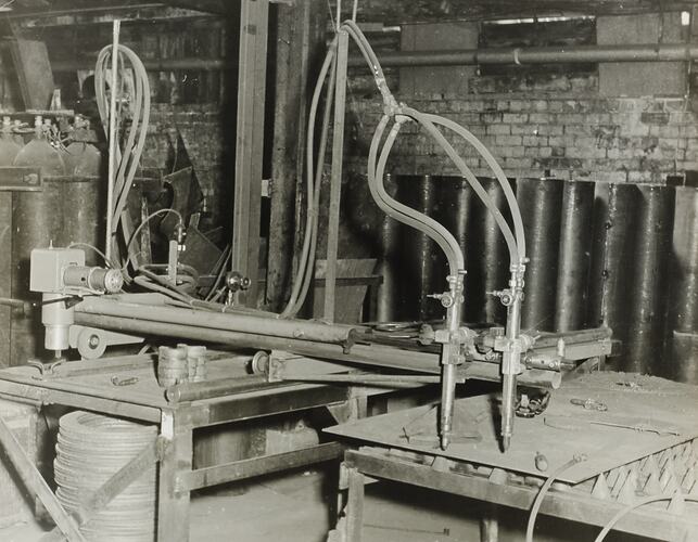 Black and white image depicting industrial equipment. It is part of a collection of photographs and marked printer's copy used in the preparation of trade literature promoting products manufactured by the Schumacher Mill Furnishing Works Pty Ltd. The items were originally housed in a wooden filing drawer, with many filed by subject. This photograph was previously filed under 'Miscellaneos'.