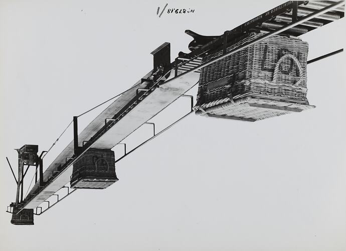 Black and white promotional image of baskets on a roller conveyor belt. It is part of a collection of photographs and marked printer's copy used in the preparation of trade literature promoting products manufactured by the Schumacher Mill Furnishing Works Pty Ltd. The items were originally housed in a wooden filing drawer, with many filed by subject.