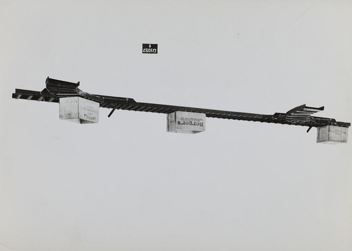 Printed on the front of photograph: 'D.1057 1 1.' Handwritten in black ink on the back of photograph: '39.' Printed in black ink on back of photograph: 'Kerr / BROS. / COMMERCIAL / PHOTOGRAPHERS / 533 COLLINS ST. MELBOURNE / SCHUMACHER MILL FURNISHING WORKS PTY. LTD. / GRAHAM ST. PORT MELBOURNE. / S. C. 7 VICTORIA. / TELEPHONE MX 2171 / GRAVITY ROLLER CONVEYOR CURVES SUPPLIED TO ORDER 36702 / (CURVES ONLY A/c PATERSON'S) / (STRAIGHT LENGTHS USED TO ENABLE PHOTO TO BE TAKEN / OF CURVES)' Printed in red ink on back of photograph: 'OFFICE COPY.'