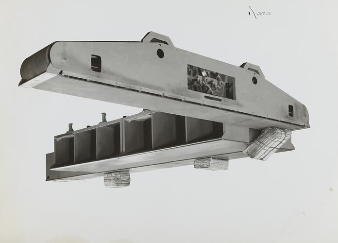 Black and white promotional image of a conveyor. It is part of a collection of photographs and marked printer's copy used in the preparation of trade literature promoting products manufactured by the Schumacher Mill Furnishing Works Pty Ltd. The items were originally housed in a wooden filing drawer, with many filed by subject.