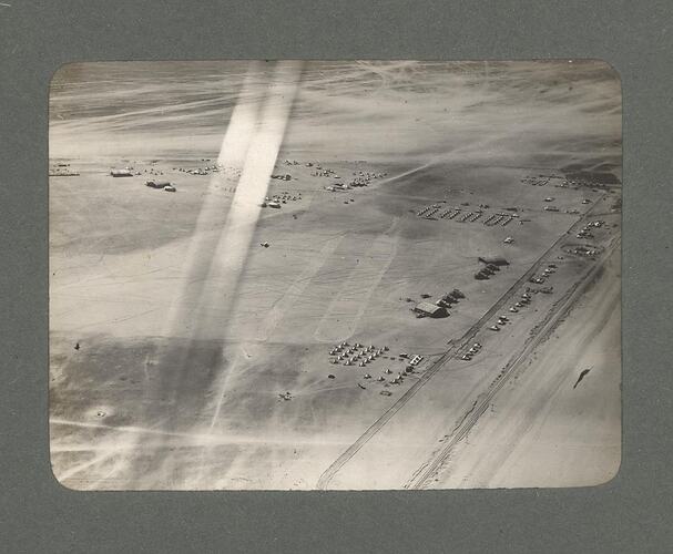 One of an album of 32 black and white photographs of the Middle East during World War I, probably taken by Australian Flying Corps photographer Norman Henry Clutterbuck, the maternal uncle of the previous owner Ray Kerby. The album mostly contains aerial photographs of locations around the Middle East, some of which appear to be duplicates of photographs found in the war diaries of the No. 1 Squadron, Australian Flying Corps, held at the Australian War Memorial. The album also contains images of what appears to be either the Second or Third Gaza Campaigns. The album ST 41220, from the same source, contains copies of some of the images in this album.