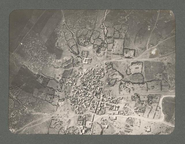 One of an album of 32 black and white photographs of the Middle East during World War I, probably taken by Australian Flying Corps photographer Norman Henry Clutterbuck, the maternal uncle of the previous owner Ray Kerby. The album mostly contains aerial photographs of locations around the Middle East, some of which appear to be duplicates of photographs found in the war diaries of the No. 1 Squadron, Australian Flying Corps, held at the Australian War Memorial. The album also contains images of what appears to be either the Second or Third Gaza Campaigns. The album ST 41220, from the same source, contains copies of some of the images in this album.