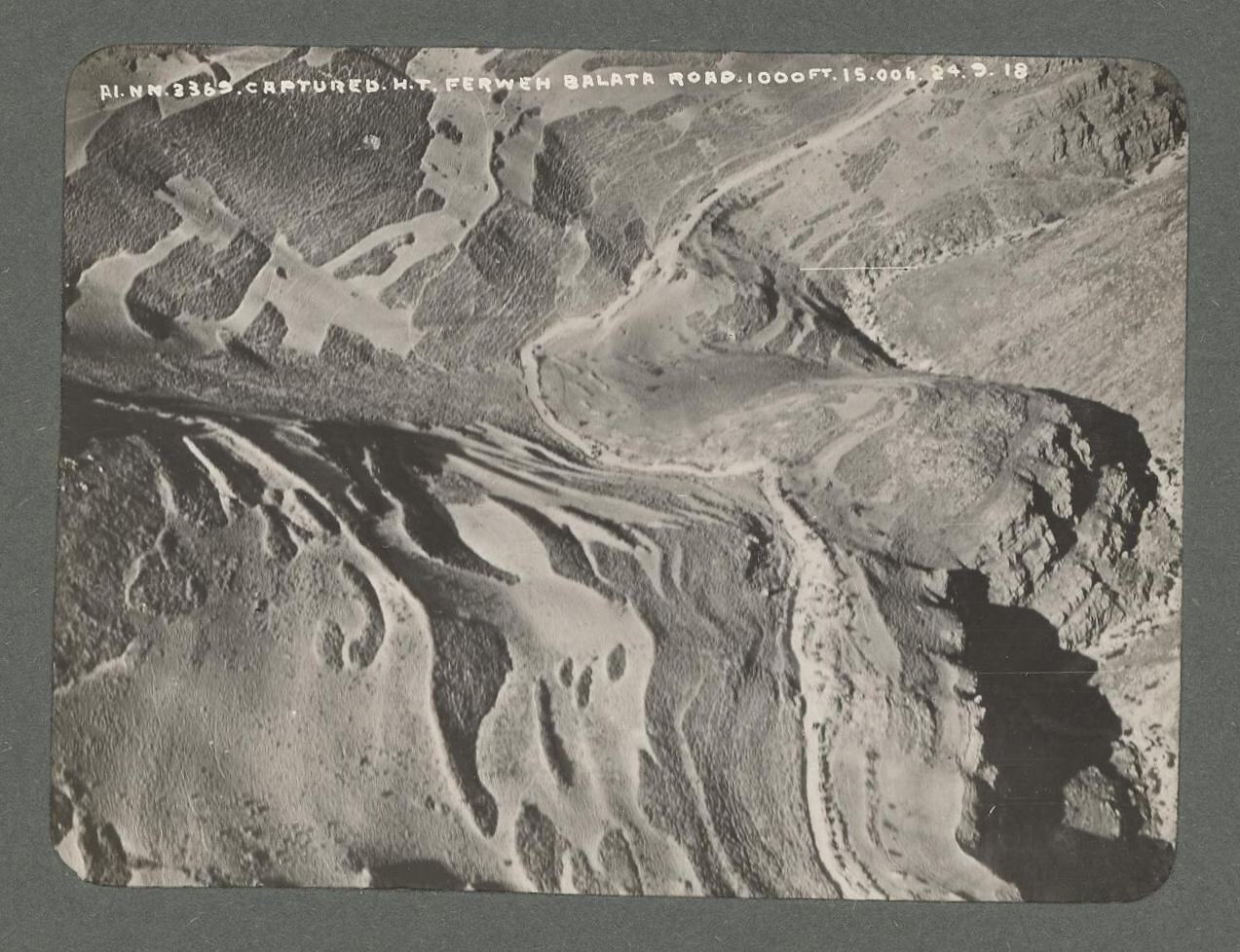 Hand-written in white ink along the top margin of the photograph: 'AI.NN. 3369. CAPTURED. H.T. FERWEH BALATA ROAD. 1000FT. 15.00h. 24.9.18'