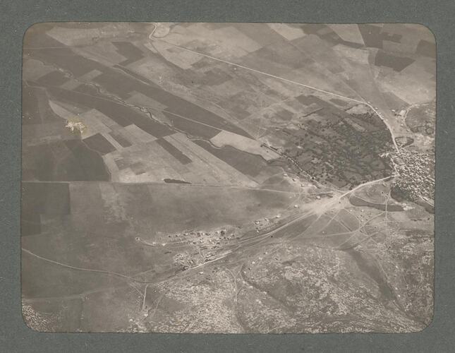 One of an album of 32 black and white photographs of the Middle East during World War I, probably taken by Australian Flying Corps photographer Norman Henry Clutterbuck, the maternal uncle of the previous owner Ray Kerby. The album mostly contains aerial photographs of locations around the Middle East, some of which appear to be duplicates of photographs found in the war diaries of the No. 1 Squadron, Australian Flying Corps, held at the Australian War Memorial. The album also contains images of what appears to be either the Second or Third Gaza Campaigns. The album ST 41220, from the same source, contains copies of some of the images in this album.