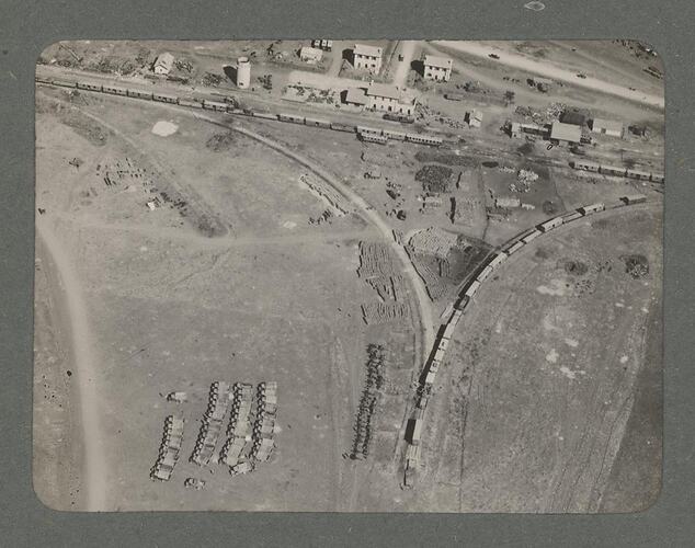 Aerial photograph of captured rolling stock near Tulkeram, in what was then Palestine.