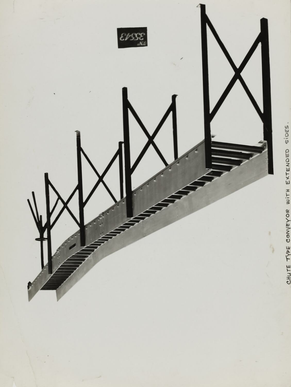 Printed in black on the front of photograph: 'OrNo / 35543' Handwritten in black ink on the front of photograph: 'CHUTE TYPE CONVEYOR WITH EXTENDED SIDES.' Handwritten in black ink on the back of photograph: '46' Printed in red ink on back of photograph: 'OFFICE COPY' Printed in purple ink on back of photograph: 'Kerr / BROS. / COMMERCIAL / PHOTOGRAPHERS / 533 COLLINS ST. MELBOURNE' Printed in black ink on back of photograph: 'SCHUMACHER MILL FURNISHING WORKS PTY. LTD. / GRAHAM ST. PORT MELBOURNE. / S. C. 7 VICTORIA. / TELEPHONE MX 2171'