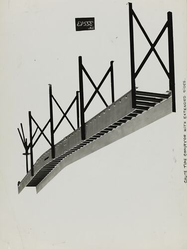 Black and white promotional image of a chute type conveyor. It is part of a collection of photographs and marked printer's copy used in the preparation of trade literature promoting products manufactured by the Schumacher Mill Furnishing Works Pty Ltd. The items were originally housed in a wooden filing drawer, with many filed by subject.