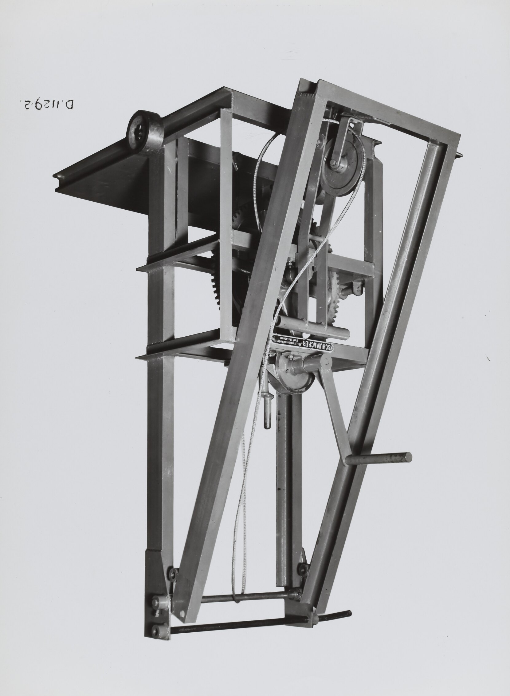 Black and white promotional image of machinery. It is part of a collection of photographs and marked printer's copy used in the preparation of trade literature promoting products manufactured by the Schumacher Mill Furnishing Works Pty Ltd. The items were originally housed in a wooden filing drawer, with many filed by subject.