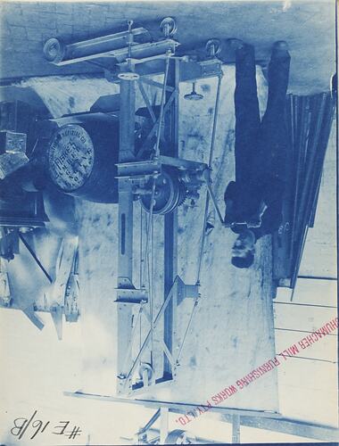 Cyanotype promotional image of a man using machinery in factory. It is part of a collection of photographs and marked printer's copy used in the preparation of trade literature promoting products manufactured by the Schumacher Mill Furnishing Works Pty Ltd. The items were originally housed in a wooden filing drawer, with many filed by subject.