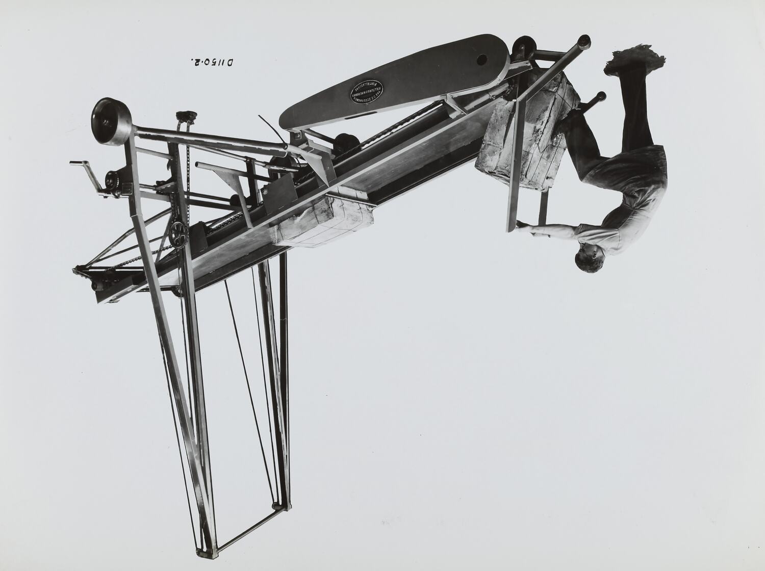 Black and white promotional image of a man using a portable pulp bale elevator machine. It is part of a collection of photographs and marked printer's copy used in the preparation of trade literature promoting products manufactured by the Schumacher Mill Furnishing Works Pty Ltd. The items were originally housed in a wooden filing drawer, with many filed by subject.