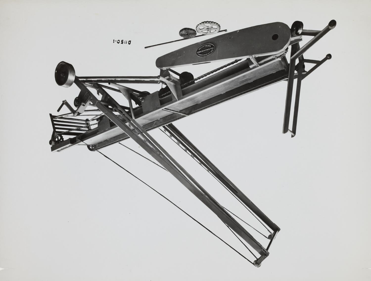 Black and white promotional image of a portable pulp bale elevator machine. It is part of a collection of photographs and marked printer's copy used in the preparation of trade literature promoting products manufactured by the Schumacher Mill Furnishing Works Pty Ltd. The items were originally housed in a wooden filing drawer, with many filed by subject.
