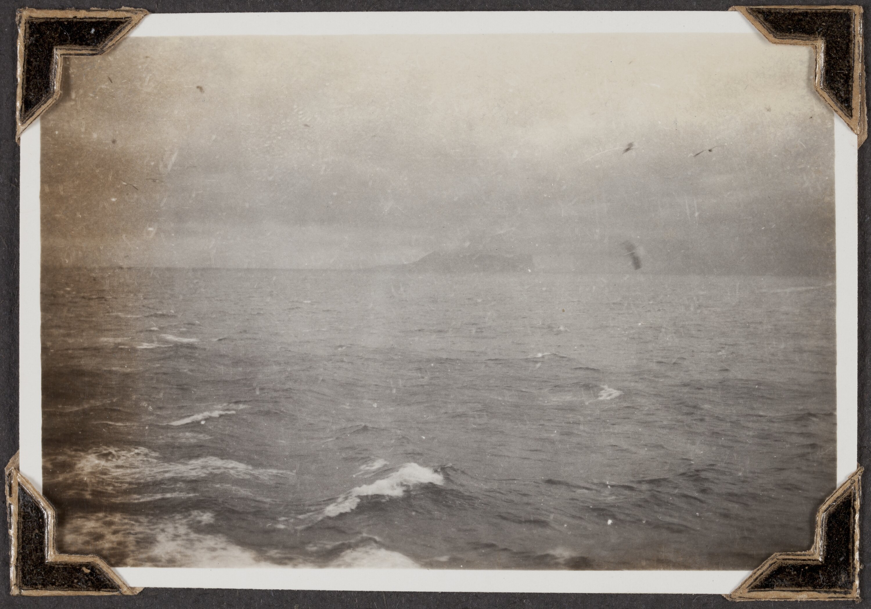 Black and white photograph titled 'Poor visibility - misty, Approaching the Rock', it shows the Rock of Gibraltar in the distance, taken 28 February 1947. It is part of a leather-bound photo album created by George Palmer during his migrant voyage from England to Australia on the RMS Orion in 1947. George migrated to Australia with his wife Gertrude and their two daughters, Shirley and Lesley.