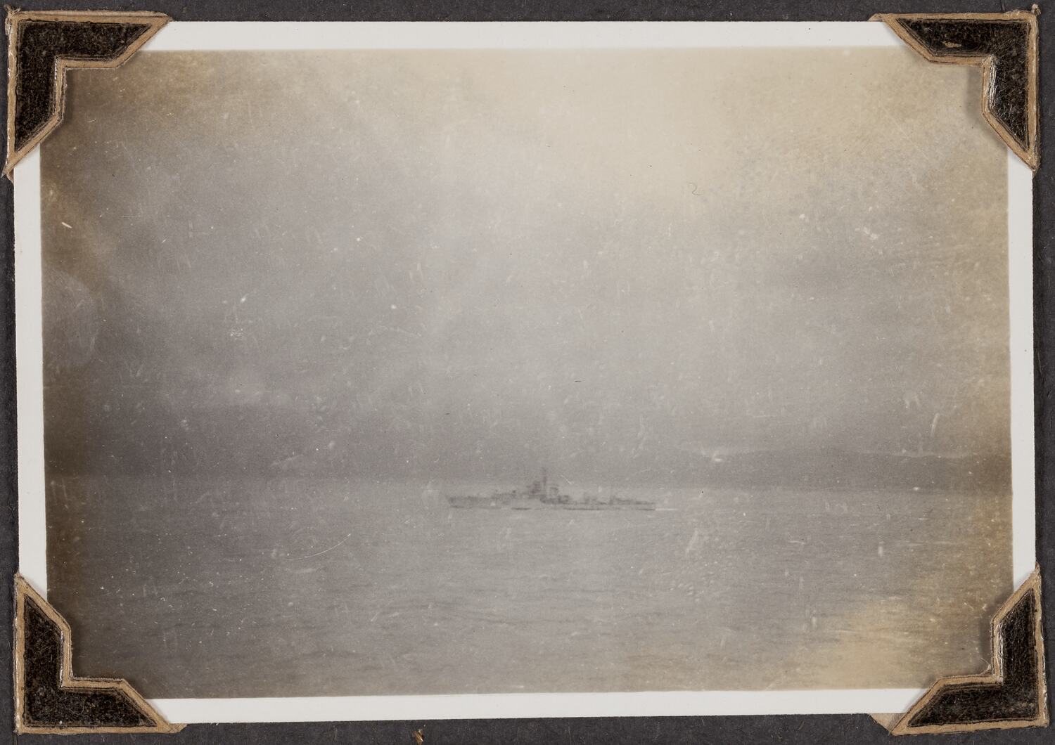 Black and white photograph titled 'One of the four Destroyers', it shows a ship at sea, taken 28 February 1947. It is part of a leather-bound photo album created by George Palmer during his migrant voyage from England to Australia on the RMS Orion in 1947. George migrated to Australia with his wife Gertrude and their two daughters, Shirley and Lesley.