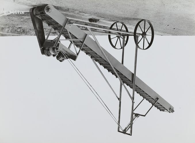Black and white promotional image of a portable elevating beam conveyor-elevator. It is part of a collection of photographs and marked printer's copy used in the preparation of trade literature promoting products manufactured by the Schumacher Mill Furnishing Works Pty Ltd. The items were originally housed in a wooden filing drawer, with many filed by subject.