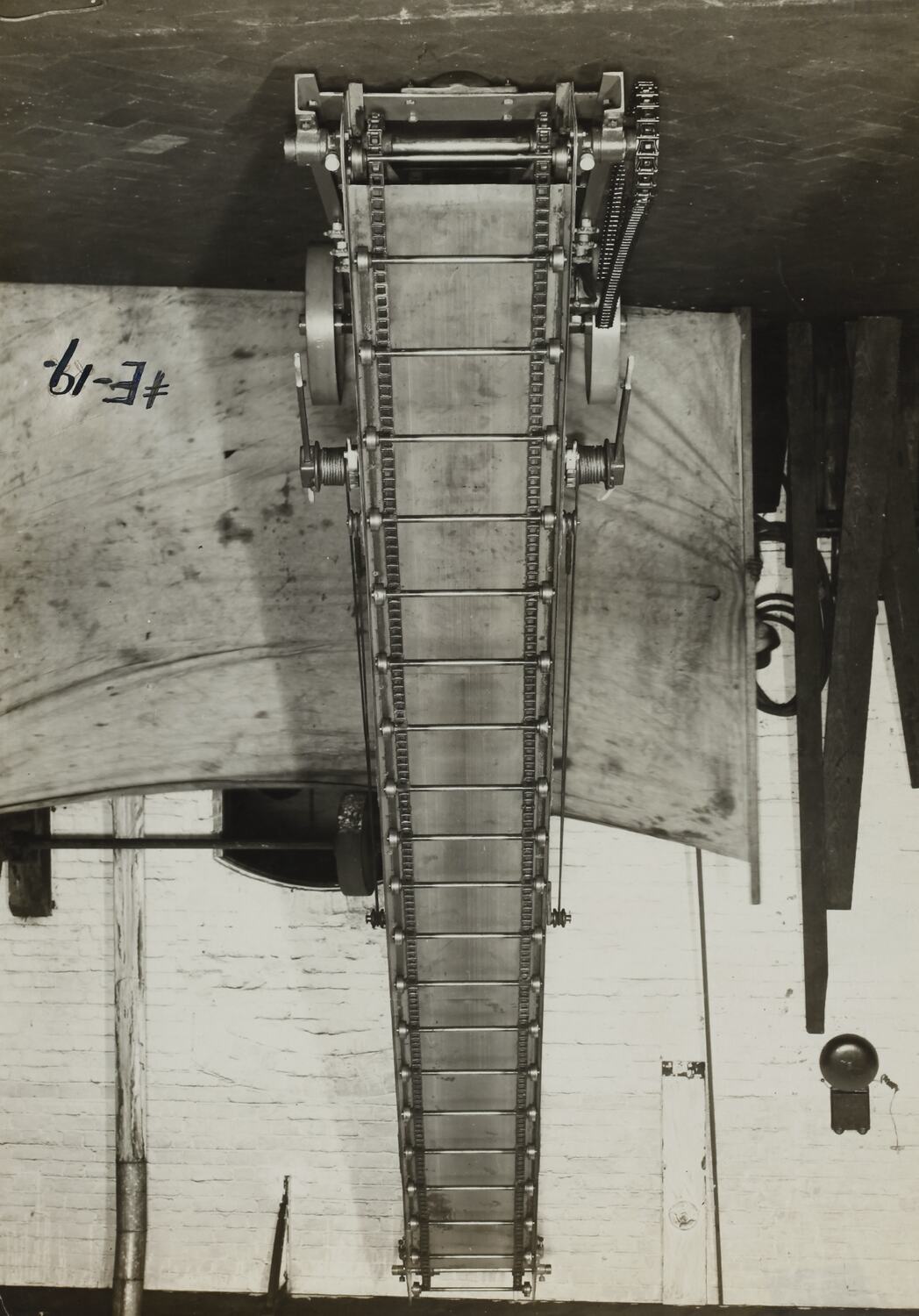 Black and white promotional image of an elevator. It is part of a collection of photographs and marked printer's copy used in the preparation of trade literature promoting products manufactured by the Schumacher Mill Furnishing Works Pty Ltd. The items were originally housed in a wooden filing drawer, with many filed by subject.