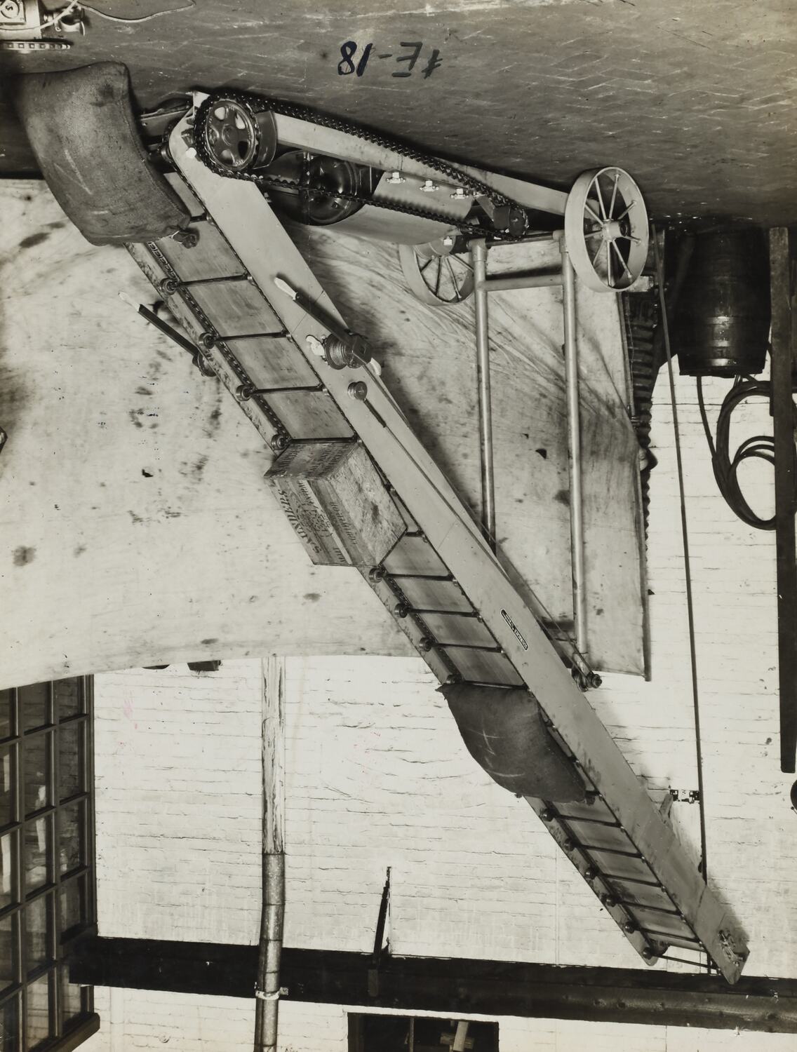 Handwritten in black ink on the front of photograph: '#E-18' Printed in red ink on the back of photograph: 'PHOTO FILE NO / SECTION NO / SCHUMACHER MILL FURNISHING WORKS PTY. LTD.' Handwritten in black ink on the back of photograph: '18 / Please return to: / Port Melbourne. / Portable Stacking Elevator' Handwritten in grey pencil on the back of photograph: '6. / 14 bags / fig 3 / M.P / height 18'' Handwritten in red pencil on the back of photograph: 'OFFICE COPY' Handwritten in blue pencil on the back of photograph: 'E1'