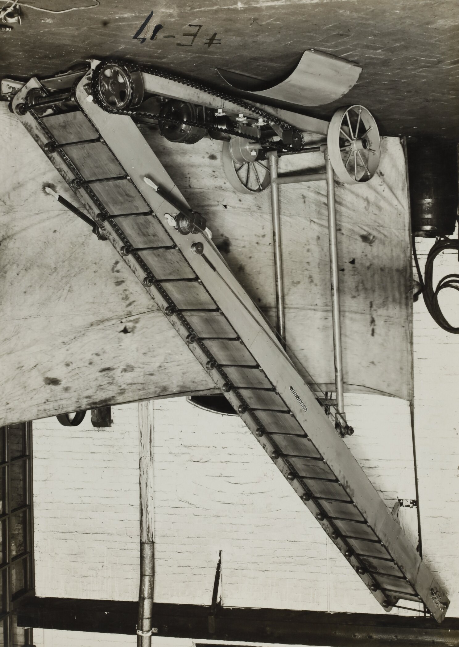 Black and white promotional image of a portable stacking elevator. It is part of a collection of photographs and marked printer's copy used in the preparation of trade literature promoting products manufactured by the Schumacher Mill Furnishing Works Pty Ltd. The items were originally housed in a wooden filing drawer, with many filed by subject.