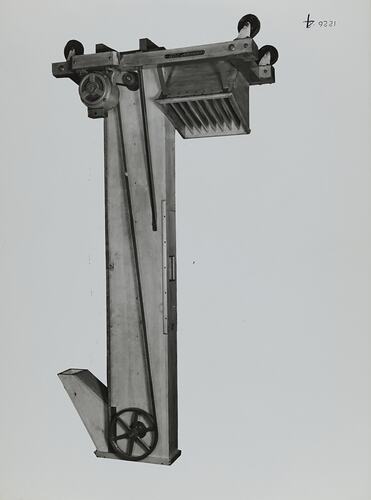 Black and white promotional image of a machine. It is part of a collection of photographs and marked printer's copy used in the preparation of trade literature promoting products manufactured by the Schumacher Mill Furnishing Works Pty Ltd. The items were originally housed in a wooden filing drawer, with many filed by subject.