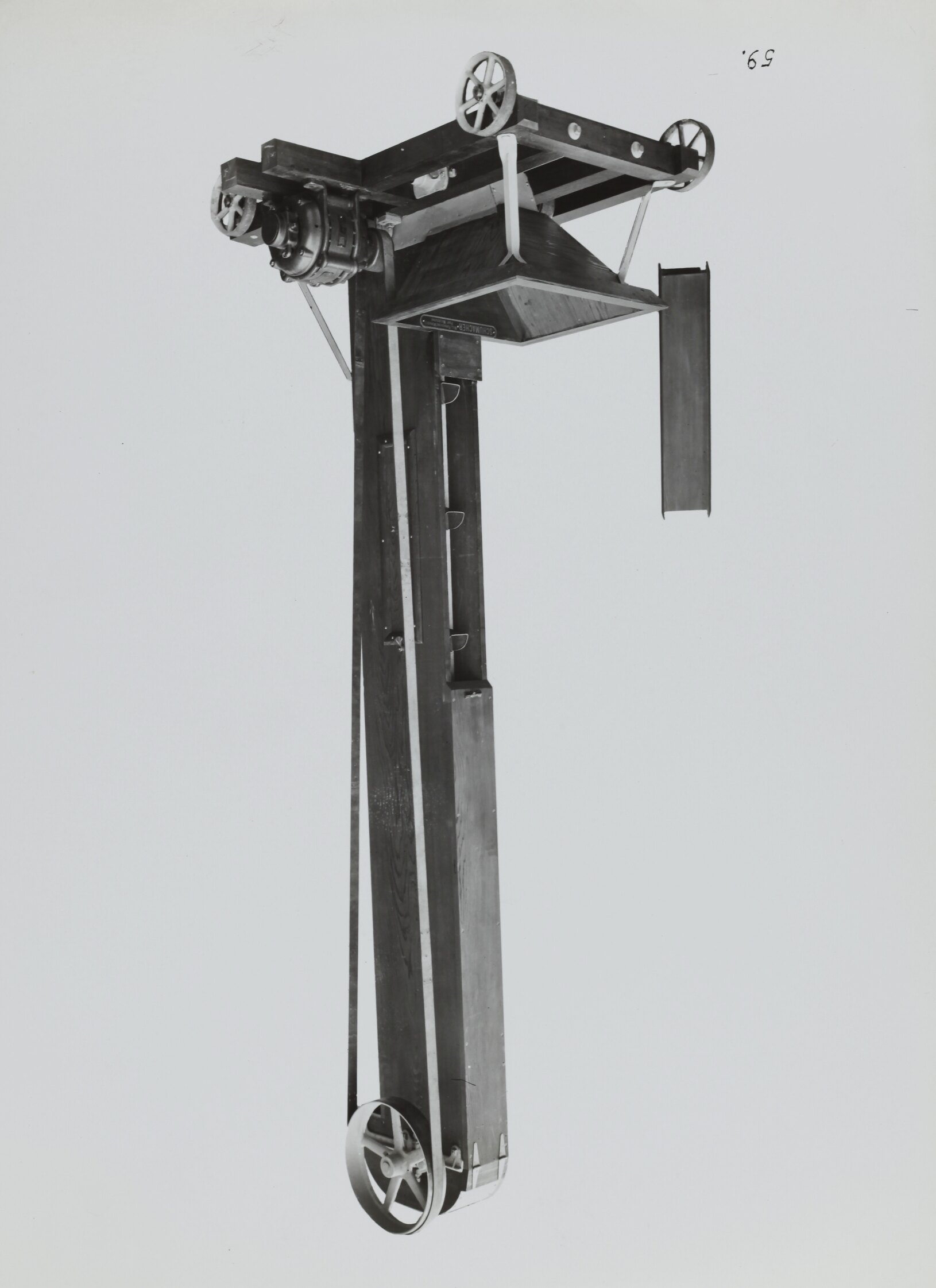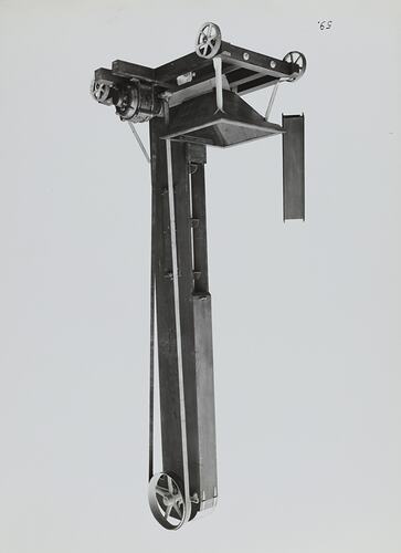 Black and white promotional image of a machine. It is part of a collection of photographs and marked printer's copy used in the preparation of trade literature promoting products manufactured by the Schumacher Mill Furnishing Works Pty Ltd. The items were originally housed in a wooden filing drawer, with many filed by subject.