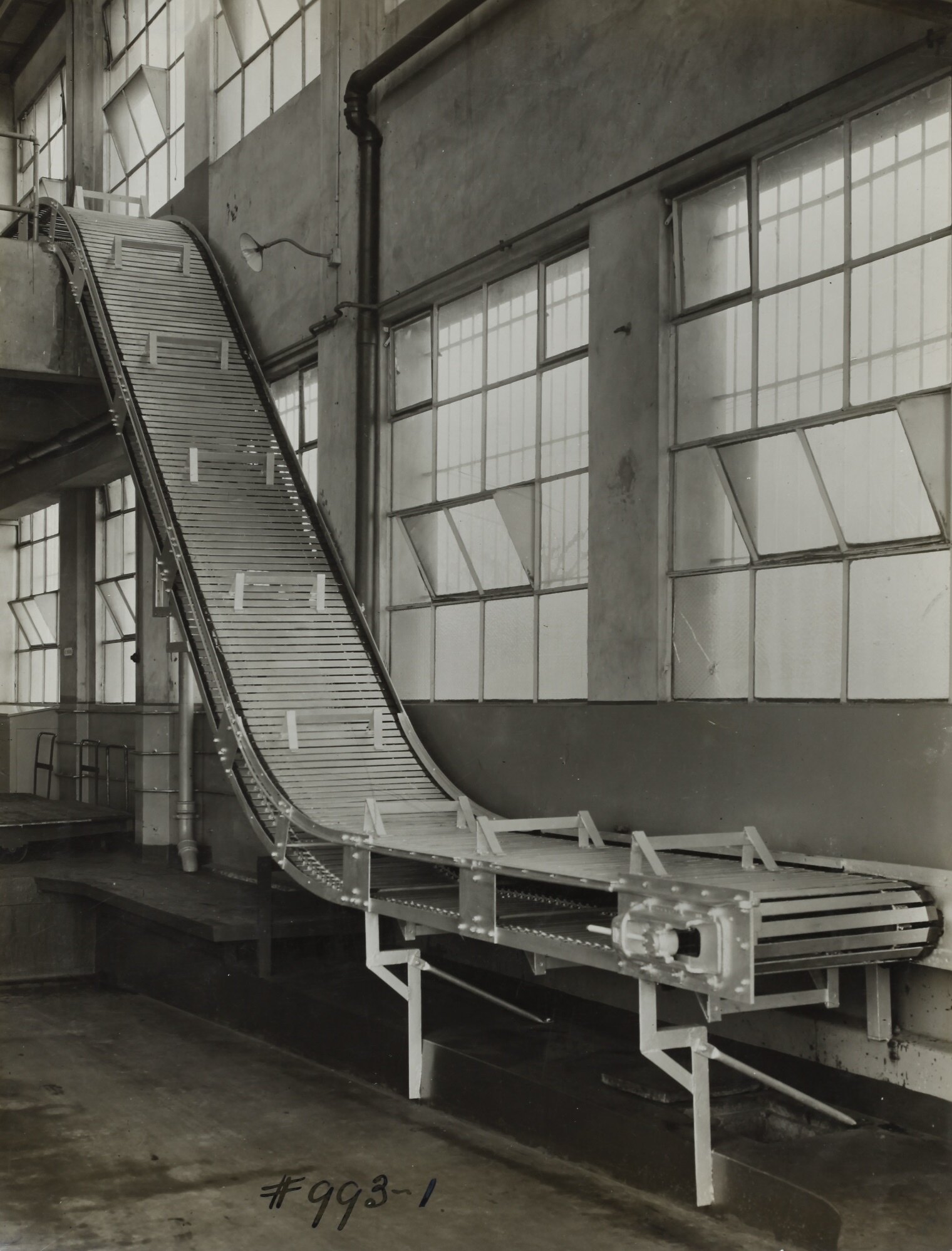 Handwritten in black ink on the front of photograph: '#993-1' Printed in purple ink on back of photograph: 'Kerr / BROS. / COMMERCIAL / PHOTOGRAPHERS / 533 COLLINS ST. MELBOURNE' Printed in black ink on cream label attached to back of photograph: '13/7/39. / From / Schumacher Mill Furnishing Works / PROPRIETARY LIMITED. / SUPPLIED TO PETERS AMERICAN / DELICACY CO. - O.N. 34310 - / 30/11/35. / ICE ELEVATING CONVEYOR. / PORT MELBOURNE, / VICTORIA.' Printed in red ink on back of photograph: PHOTO FILE NO / SECTION NO' Handwritten in red pencil on back of photograph: 'OFFICE COPY' Handwritten in black ink on back of photograph: '8 / 8' Handwritten in grey pencil on back of photograph: '4 / heatlet'