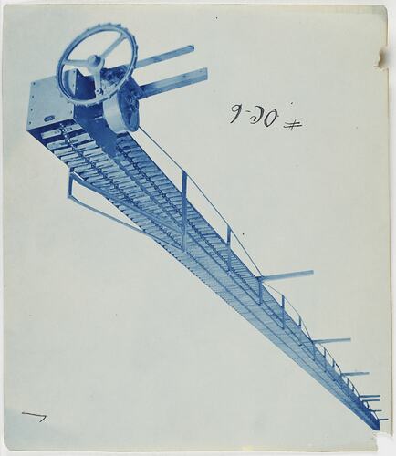 Cyanotype promotional image of a conveyor. It is part of a collection of photographs and marked printer's copy used in the preparation of trade literature promoting products manufactured by the Schumacher Mill Furnishing Works Pty Ltd. The items were originally housed in a wooden filing drawer, with many filed by subject.