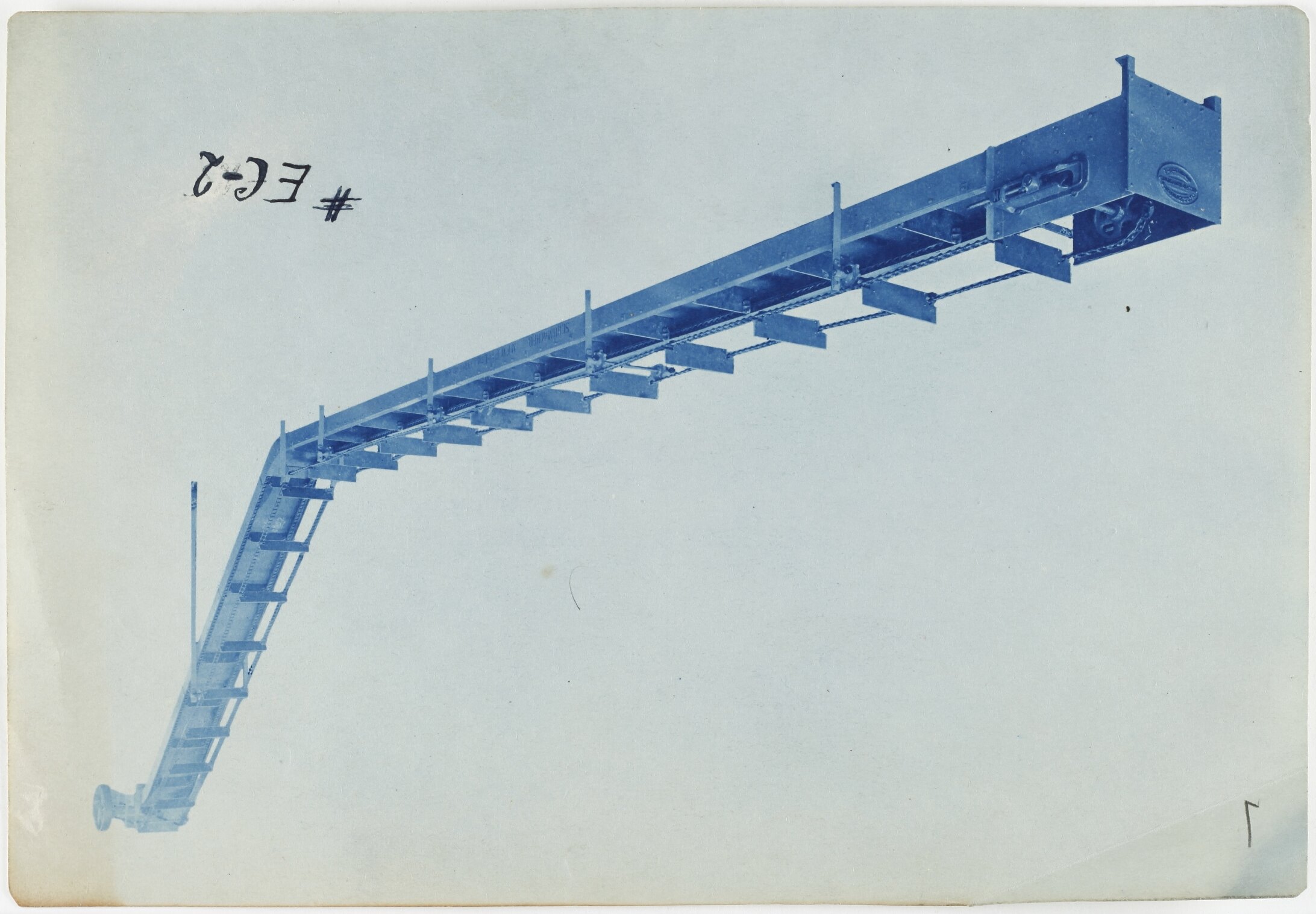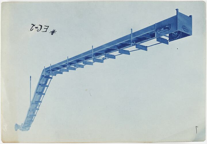 Cyanotype promotional image of a conveyor. It is part of a collection of photographs and marked printer's copy used in the preparation of trade literature promoting products manufactured by the Schumacher Mill Furnishing Works Pty Ltd. The items were originally housed in a wooden filing drawer, with many filed by subject.