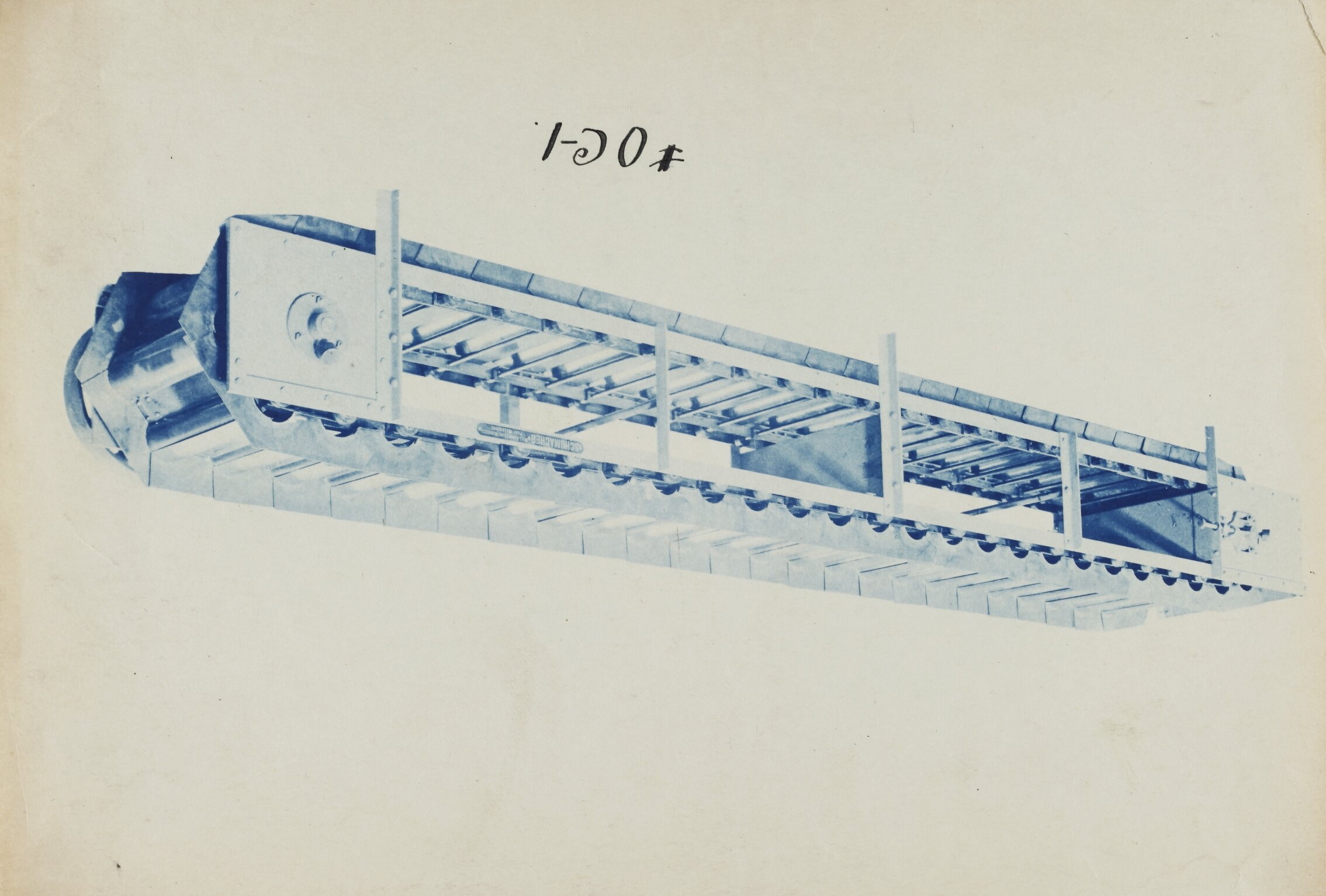 Cyanotype promotional image of an apron feeding conveyor. It is part of a collection of photographs and marked printer's copy used in the preparation of trade literature promoting products manufactured by the Schumacher Mill Furnishing Works Pty Ltd. The items were originally housed in a wooden filing drawer, with many filed by subject.