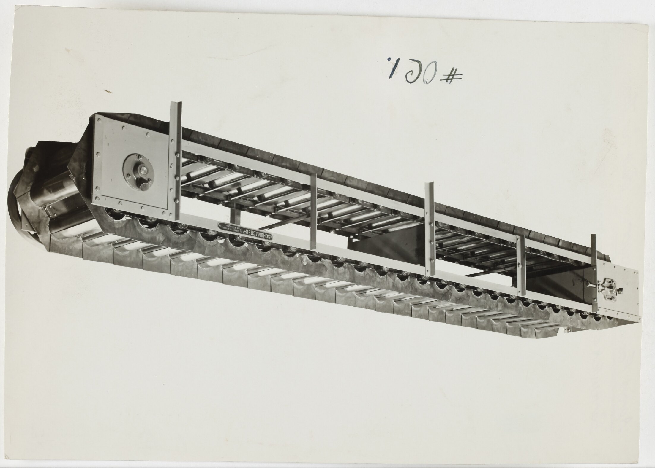Black and white promotional image of an apron feeding conveyor. It is part of a collection of photographs and marked printer's copy used in the preparation of trade literature promoting products manufactured by the Schumacher Mill Furnishing Works Pty Ltd. The items were originally housed in a wooden filing drawer, with many filed by subject.
